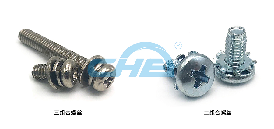 组合螺丝是指一个螺丝配一个弹垫再配一个平垫,通过搓牙,组合紧固在一起的组合件。二组合是指一个螺丝只配一个弹垫或只配一个平垫。还可以有只配一个花齿的二组合件。